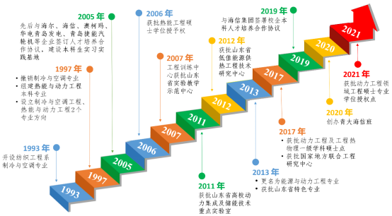 本专业起源于1993年h动漫 纺织工程系的制冷与空调专业。1999年,h动漫 热能与动力工程专业正式开办,后于2013年更名为能源与动力工程专业。下设有制冷与空调工程、热能工程2个专业方向。2006年获批热能工程硕士学位授予权,2013年获批山东省特色专业,2017年获批动力工程及工程热物理一级学科硕士学位授权点,2021年设置动力工程领域工程硕士专业学位授权点,同时本科专业增设新能源与储能专业方向。首届本科生毕业于2003年。本专业现有制冷与空调工程、热能工程和新能源与储能三个本科专业方向。其他重要节点参见下图所示