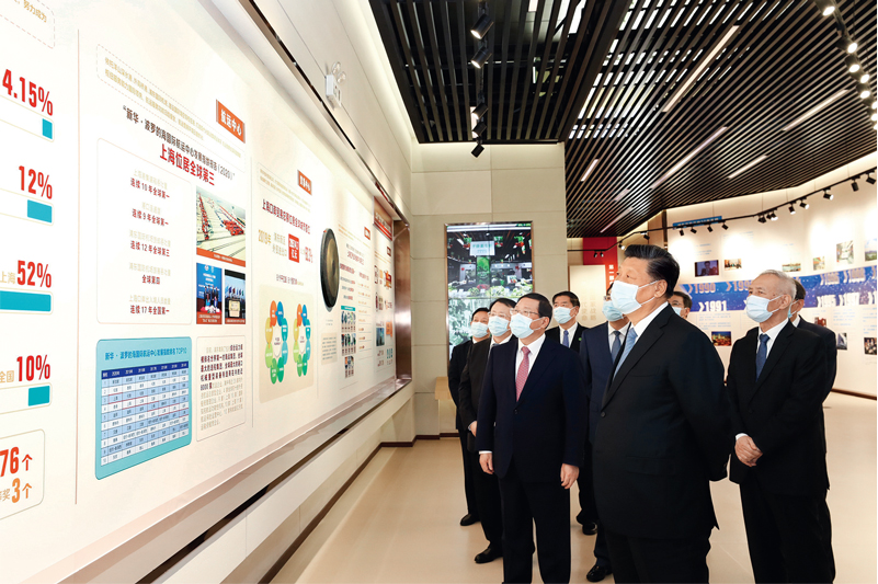 2020年11月12日,浦东开发开放30周年庆祝大会在上海市举行。中共中央总书记、国家主席、中央军委主席习近平在会上发表重要讲话。这是当天上午,习近平等参观“在国家战略的引领下——浦东开发开放30周年主题展”。 新华社记者 鞠鹏/摄