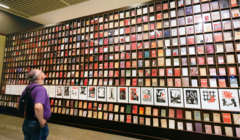2018年5月9日,一位外国观众被北京“真理的力量——纪念马克思诞辰200周年主题展览”中一面展示不同国家出版的500多种《共产党宣言》的书墙所吸引。